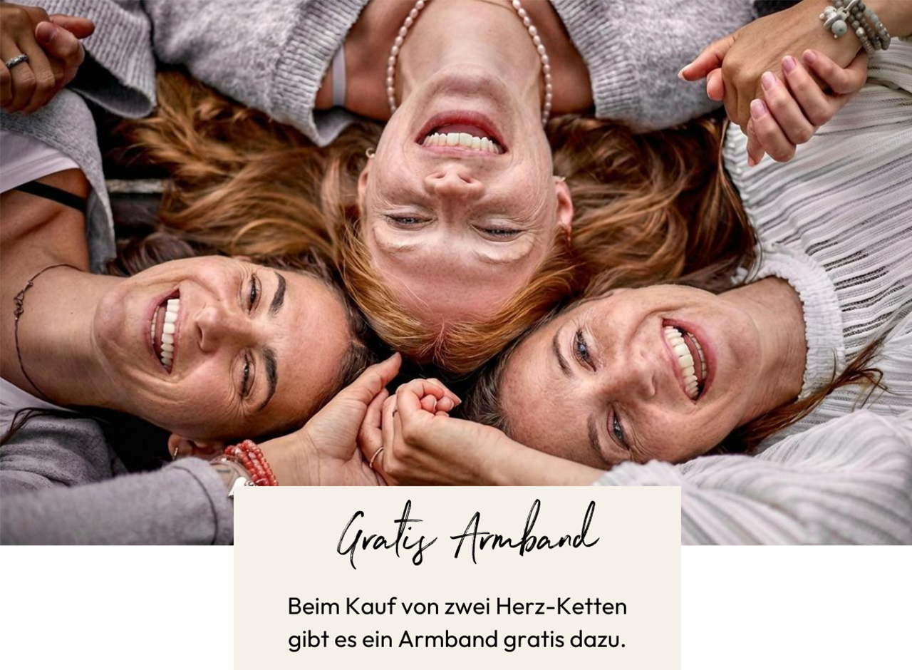 Unter dem Motto „Frauen schenken Frauen“ erhältst du beim Kauf von zwei Halsketten ein exklusives Armband aus Dalmatiner Jaspis als Geschenk dazu. So könnt ihr eure Verbundenheit durch ein gemeinsames Schmuckstück zeigen.